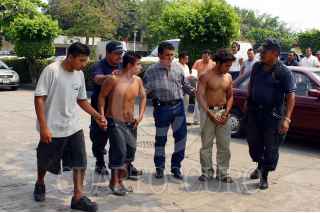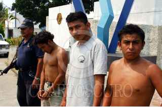 VILLAHERMOSA, TABASCO, 26 MAYO2005.-Como resultado de los trabajos realizados de manera coordinada entra los elementos de la Policía Estatal y la Procuraduría General de Justicia, para darle seguimiento al esclarecimiento del asalto, robo, secuestro e intento de homicidio perpetrado en agravio de Manuel Osorio García, esta mañana fueron detenidos los presuntos responsables que se encontraban prófugos de la justicia; quienes responden a los nombres de Juan Carlos Cordero Gómez (a) “El Cordero”, Juan Carlos González de la Cruz (a) “EL Plomo” y Manuel Hernández Reyes (8) “El Chaneque”, los cuales fueron identificados por la víctima, al que asaltaron, despojaron de su vehículo y dinero, además de golpearlo, amordazarlo y privarlo de su libertad. FOTO: Marco Polo Guzmán/CUARTOSC URO.COM
