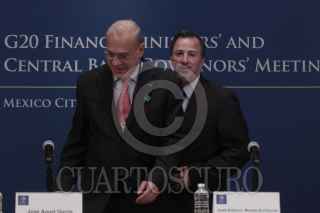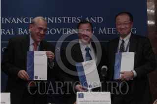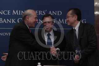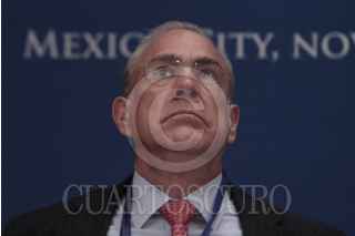 MÉXICO, D.F., 04NOVIEMBRE2012.-Jose Angel Gurria, Secretario General de la OCDE junto a Jose Antonio Meade Curibeña, Secretario de Hacienda y Credito Publico y Jim Yong Kim, Presidente del Banco Mundial durante la conferencia ante los medios de comunicación sobre el aumento de la fortaleza financiera a traves del manejo de desastres. FOTO: ENRIQUE ORDÓÑEZ /CUARTOSCURO.COM