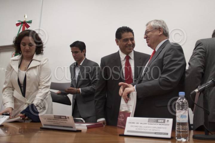 MÉXICO, D.F., 06NOVIEMBRE2012.- Christopher Pierre, Nuncio Apostólico en México, y Jorge Herrera Caldera, gobernador de Durango, durante la presentación del libro "La Reforma del Estado, un Camino de Acuerdos", publicado por la comisión de la Conferencia Nacional de Gobernadores, la cita fue en el auditorio del Instituto Matías Romero. FOTO: MOISÉS PABLO /CUARTOSCURO.COM