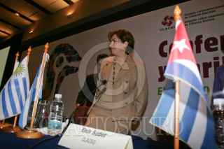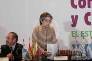 MÉXICO, D.F. 06NOVIEMBRE2012.- La canciller Patricia Espinoza participó en la inaguración XXIV Asamblea General del Consejo Latinoamericano de Ciencias Sociales CLACSO, de donde tuvo que salir por la puerta trasera después de chiflidos y gritos de “asesinos", "no a los asesinatos de migrantes”, "fraude", entre otros, por parte de estudiantes de la UNAM, UAM y COLMEX que asistieron al evento e interrumpieron la ponencia de Espinoza. FOTO: JUAN PABLO ZAMORA /CUARTOSCURO.COM