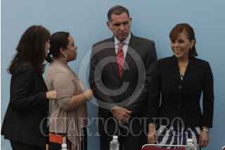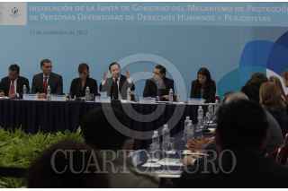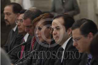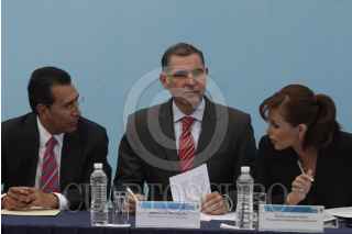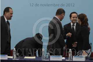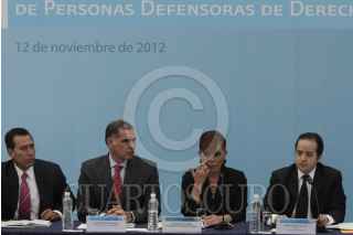 MÉXICO, D.F., 12NOVIEMBRE2012.- Facundo Rosas, subsecretario de Prevención, Vinculación y Derechos Humanos junto a Gabino Cue, Gobernador de Oaxaca; Marisela Morales, Procuradora de la Republica y Alejandro Poire durante la instalacioin de la junta de gobierno del mecanismo de protección a personas Defensoras de Derechos Humanos y Periodistas. FOTO: ENRIQUE ORDÓÑEZ /CUARTOSCURO.COM
