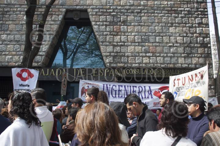 MÉXICO, D.F., 14NOVIEMBRE2012.- Trabajadores del Sindicato de Trabajadores de la Universidad Nacional Autónoma de México se manifestaron afuera de la embajada de España, que se ubica en la calle de Galileo en Polanco, esto en solidaridad por la huelga general que se vive en aquel país generada por la crisis y los recortes gubernamentales. FOTO: MOISÉS PABLO /CUARTOSCURO.COM