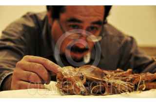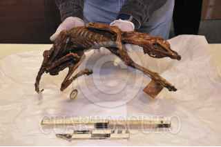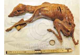 MÉXICO, D.F., 14NOVIEMBRE2012.- Un perro momificado de alrededor de 1,000 años de antigüedad, hallado en la Cueva de la Candelaria, en Coahuila, el único que se ha encontrado, hasta ahora, en México en esta condición, será sometido a diversos estudios, entre ellos radiografías y ADN, luego que el Instituto Nacional de Antropología e Historia (INAH-Conaculta) lo recuperó y reintegró a los acervos arqueológicos que resguarda, después de haber estado en manos de particulares. De acuerdo con especialistas del INAH, se trata además de uno de los pocos ejemplares de cánidos momificados en el mundo —solo se conocen casos similares en Perú y en Egipto—, el cual fue reintegrado al patrimonio cultural de la nación, junto con 2,500 materiales arqueológicos encontrados en dicha caverna en 1953. El cánido desecado, cuya antigüedad se estima en 1,000 años de antigüedad, será sometido a una serie de análisis, luego de haber sido integrado a los acervos arqueológicos del INAH FOTO: MAURICIO MARAT /CUARTOSCURO.COM