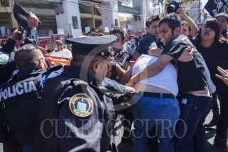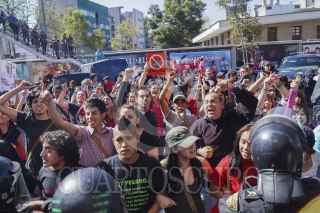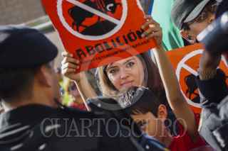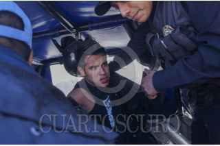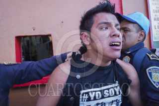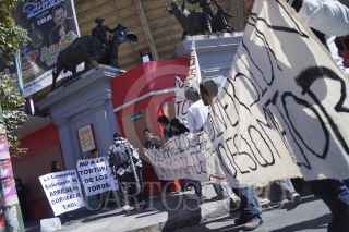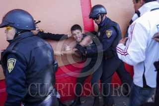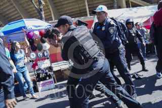 MÉXICO D.F., 18NOVIEMBRE2012.- Integrantes del "Movimiento en Defensa de los Animales", asi como también miembros de otras organizaciones como YoSoy132, realizaron una acto de protesta frente a la Plaza de Toros México, algunos manifestantes impidieron la venta de boletos posicionandose en las taquillas, lo que ocasionó forcejeos con las autoridades y 4 manifestantes consignados por la agrupación de granaderos. FOTO: PEDRO ANZA /CUARTOSCURO.COM