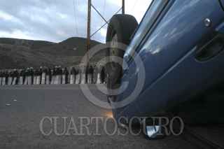 MITLA, OAXACA, 21NOVIEMBRE2012.- Luego de soportar el bloqueo carretero por más de cinco horas, pobladores de San Pablo Villa de Mitla, Santiago Matatlán, San Dionisio Ocotepec y Totolapan hicieron frente a los maestros y a base de pedradas y golpes retiraron el plantón. El saldo del enfrentamiento fue cerca de 20 personas con lesiones menores y 17 unidades con diversos daños, 4 de ellas volteadas. Los pobladores de Mitla retuvieron a cinco profesores a los cuales mantuvieron con los ojos vendados y amarrados de las manos. FOTO: ARTURO PÉREZ ALFONSO /CUARTOSCURO.COM