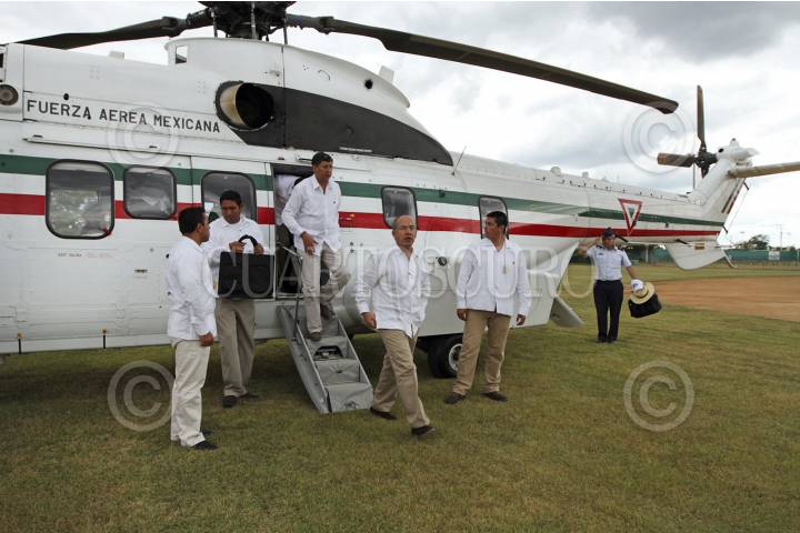 MÉRIDA YUCATÁN, 24NOVIEMBRE2012.- El Presidente de México Felipe Calderón Hinojosa realizo una visita a la capital yucateca para la entrega del certificado de tres millones de pisos de cemento en el país, la ceremonia protocolaria en el gimnasio polifuncional de la colonia San José Tecoh al sur de la ciudad. Al terminar el evento el presidente Calderón se dirigió al aeropuerto en compañía del gobernador Rolando Zapata Bello para despedirlo. FOTO: FRANCISCO BALDERAS /CUARTOSCURO.COM