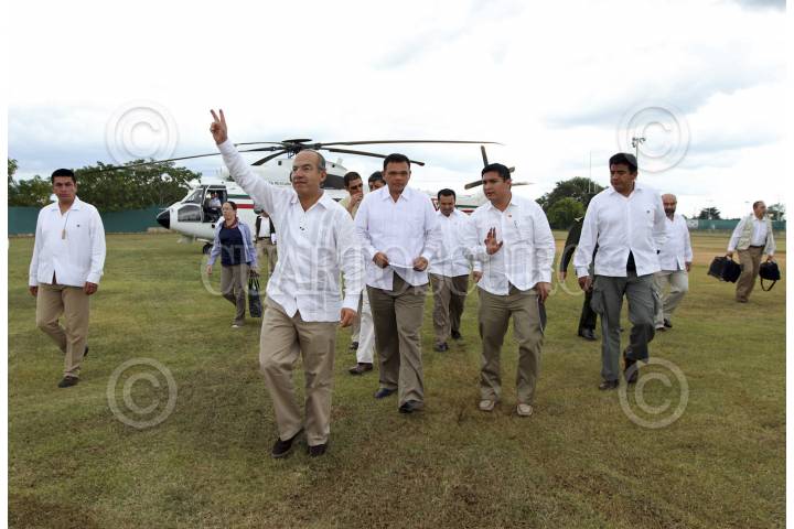 MÉRIDA YUCATÁN, 24NOVIEMBRE2012.- El Presidente de México Felipe Calderón Hinojosa realizo una visita a la capital yucateca para la entrega del certificado de tres millones de pisos de cemento en el país, la ceremonia protocolaria en el gimnasio polifuncional de la colonia San José Tecoh al sur de la ciudad. Al terminar el evento el presidente Calderón se dirigió al aeropuerto en compañía del gobernador Rolando Zapata Bello para despedirlo. FOTO: FRANCISCO BALDERAS /CUARTOSCURO.COM