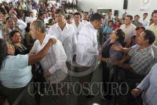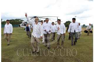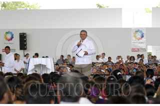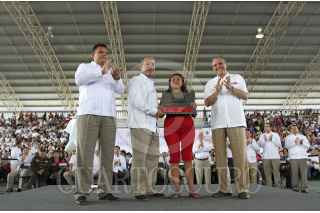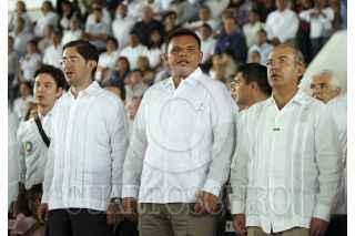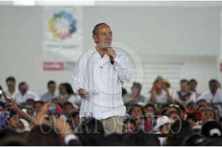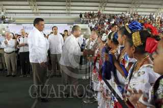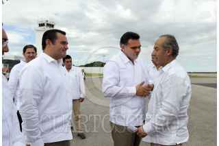 MÉRIDA YUCATÁN, 24NOVIEMBRE2012.- El Presidente de México Felipe Calderón Hinojosa realizo una visita a la capital yucateca para la entrega del certificado de tres millones de pisos de cemento en el país, la ceremonia protocolaria en el gimnasio polifuncional de la colonia San José Tecoh al sur de la ciudad. Al terminar el evento el presidente Calderón se dirigió al aeropuerto en compañía del gobernador Rolando Zapata Bello para despedirlo. FOTO: FRANCISCO BALDERAS /CUARTOSCURO.COM