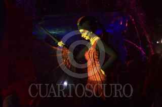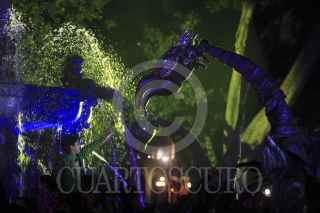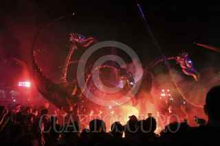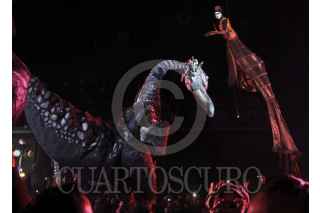 PUEBLA, PUEBLA, 26NOVIEMBRE2012.- Cientos de poblanos abarrotaron la plancha del zócalo para interactuar de manera directa con dinosaurios, acróbatas y bailarines durante la puesta en escena Invasión Parade, de la compañía holandesa Close-Act como parte de las actividades del Festival Internacional de Teatro Héctor Azar. FOTO: HILDA RÍOS /CUARTOSCURO.COM