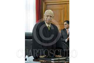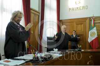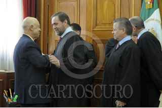 MÉXICO D.F., 28NOVIEMBRE2012.- Guillermo Ortiz Mayagoitia, ministro de la Suprema Corte de Justicia de la Nación fue despedido por sus compañeros durante la sesión de la Primera Sala, en la imagen hace lo propio Jorge Mario pardo Rebolledo y Arturo Saldivar Lelo de Larrea. FOTO: CUARTOSCURO.COM