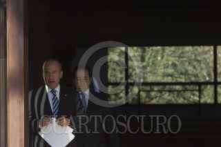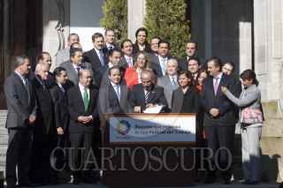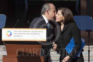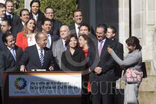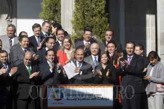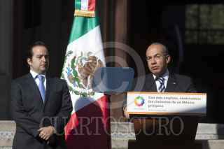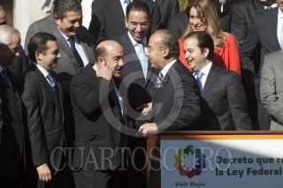 MÉXICO, D.F., 29NOVIEMBRE2012.- Ernesto Cordero, presidente de la mesa directiva del Senado, Jesús Murillo Karam, presidente de la Cámara de Diputados, Javier Lozano Alarcón, senador del PAN, Felipe Calderón Hinojosa, Presidente de México, y Alejandro Poiré, secretario de Gobernación, bromean tras la firma el decreto que reforma la Ley Federal del Trabajo en la residencia oficial de Los Pinos. FOTO: MOISÉS PABLO /CUARTOSCURO.COM