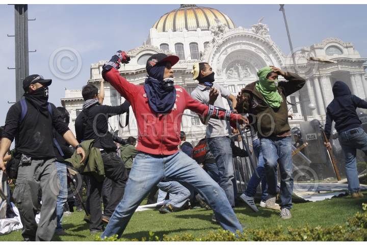 MÉXICO, D.F., 01DICIEMBRE2012.- Enfrentamiento entre manifestantes en contra del presidente Enrique Peña Nieto, y la policía, que empezó a las afueras de la Cámara de Diputados, para luego pausar el combate y continuar sobre Eje Central a la altura del Palacio de Bellas Artes. Los manifestantes fueron replegados por avenida Juárez hasta ser dispersados sobre Paseo de la Reforma, destruyendo todo a su paso para defenderse de la policía. . FOTO: PEDRO ANZA / CUARTOSCURO.COM