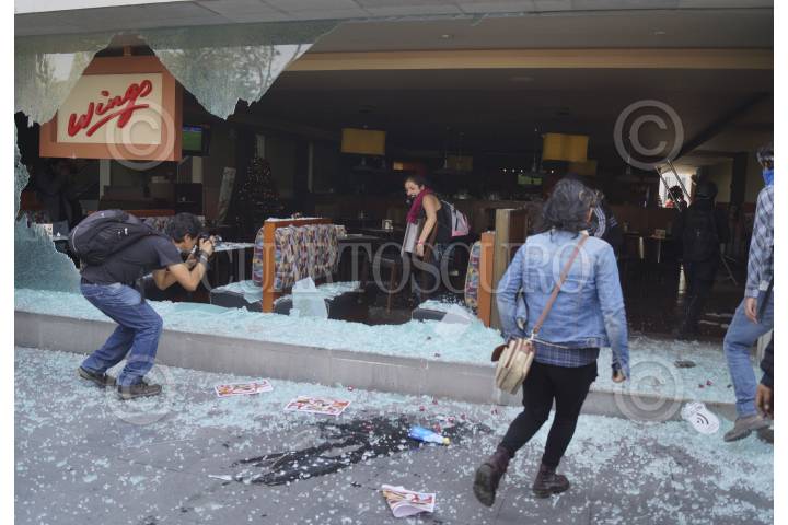 MÉXICO, D.F., 01DICIEMBRE2012.- Enfrentamiento entre manifestantes en contra del presidente Enrique Peña Nieto, y la policía, que empezó a las afueras de la Cámara de Diputados, para luego pausar el combate y continuar sobre Eje Central a la altura del Palacio de Bellas Artes. Los manifestantes fueron replegados por avenida Juárez hasta ser dispersados sobre Paseo de la Reforma, destruyendo todo a su paso para defenderse de la policía. . FOTO: PEDRO ANZA / CUARTOSCURO.COM