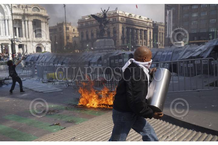 MÉXICO, D.F., 01DICIEMBRE2012.- Enfrentamiento entre manifestantes en contra del presidente Enrique Peña Nieto, y la policía, que empezó a las afueras de la Cámara de Diputados, para luego pausar el combate y continuar sobre Eje Central a la altura del Palacio de Bellas Artes. Los manifestantes fueron replegados por avenida Juárez hasta ser dispersados sobre Paseo de la Reforma, destruyendo todo a su paso para defenderse de la policía. . FOTO: PEDRO ANZA / CUARTOSCURO.COM