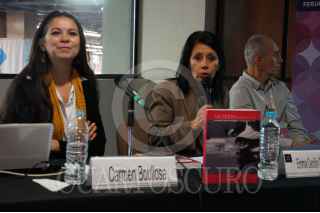 GUADALAJARA, JAL. 1DIC2012.- La poeta y escritora Carmen Boullosa, la autora del libro Emma Cecilia García Krinsky y el representante de Conaculta, Alberto Cué, presentaron el libro "Mujeres detrás de la lente. 100 años de creación fotográfica en México 1910-2012" en la Feria Internacional del Libro de Guadalajara. Foto: ANA COSTABILE/CUARTOSCURO