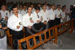 MAZATLAN, SINALOA 15JUNIO2005.- Los integrantes de la banda El Recodo, encabezaron la ceremonia luctuosa frente al mausoleo de Don Cruz Lizarraga, fundador de la agrupación musical sinaloense. FOTO: EL DEBATE DE MAZATLAN