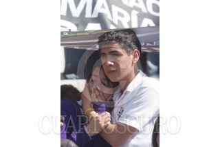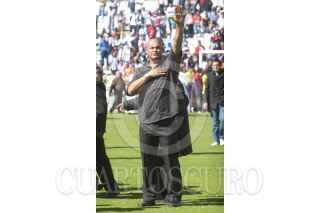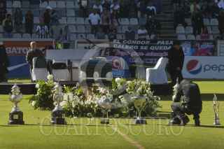 PACHUCA, HIDALGO, 05DICIEMBRE2012.- El cuerpo del portero Miguel Calero, integrante de los "Tuzos de Pachuca" fue homenajeado con una misa en el Estadio Miguel Hidalgo. El arquero de origen colombiano murió hace dos días de un infarto cerebral. Afición, jugadores, familiares, amigos y directivos del Club Pachuca despidieron a su ídolo. En la ceremonia religiosa estuvo presente su esposa Sandra Sierra, su hijo Juan José Calero y el hermano Miltón Calero, y el presidente del club Jesús Martínez, quienes recibieron las condolencias de los presentes. FOTO: FRANCISCO RODRÍGUEZ / CUARTOSCURO.COM