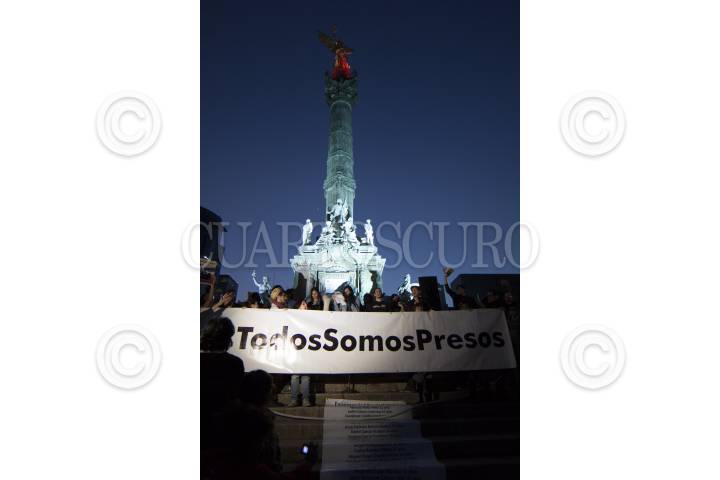 08DICIEMBRE2012.- Una protesta para pedir la libertad inmediata de los presos políticos detenidos ilegalmente por la policía durante los desmanes del 1 de diciembre, que se suscitaron en las inmediaciones de la Cámara de Diputados y avenida Juárez, se dió lugar en las escalinatas del Ángel de la Independencia con la participación de integrantes del #Yosoy132 y la sociedad civil. En manifestación se extendió una manta con la leyenda "Todos somo presos", además de una lista de los detenidos, la velada de lucha estuvo acompañada de varias bandas de rock. FOTO: MOISÉS PABLO /CUARTOSCURO.COM
