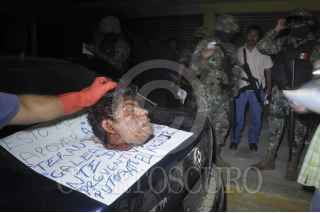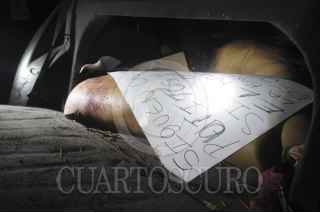 ACAPULCO, GUERRERO, 12DICIEMBRE2012.- Dos cadáveres descuartizados fueron encontrados la madrugada de este día, en el tramo carretero Cayaco-Puerto Marqués, una de las cabezas se encontraba encima de la cajuela con un mensaje y dos más en el interior del carro; uno decía: "esto me paso x apoyar a Armando Terán y al pichi Galeana y al comandante de la preventiva Daniel siguen siguen ustedes putos ATTM el KALIN JR. la “Barredora” ya “regresó” putitos “ARRE” “ARRE” con la K Barre la “Barredora” "; los otros pedazos se encontraron en el asiento trasero de un vehículo compacto. Personal de Servicios Periciales y del Servicio Médico Forense, arribaron para levantar los pedazos de los cuerpos y trasladarlos a sus instalaciones, con la finalidad de ser sometidos a la necropsia que marca la ley y poder pegar las extremidades humanas. Las autoridades aseguraron que se trata de dos hombres en calidad de desconocidos, por lo que es probable que en el transcurso de las próximas horas sean identificados y reclamados legalmente ante las autoridades correspondientes. FOTO: BERNANDINO HERNÁNDEZ /CUARTOSCURO.COM