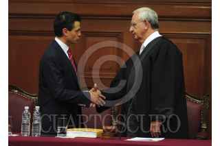 MÉXICO, D.F., 13DICIEMBRE2012.- El Presidente de México Enrique Peña Nietos saluda al presidente Juan N. Silva Meza, quien presentó su informe anual al frente de la Suprema Corte de Justicia de la Nación. FOTO: CUARTOSCURO.COM