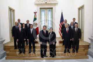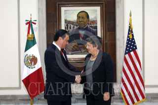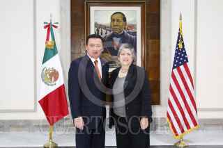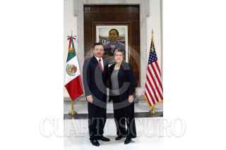 MÉXICO, D.F., 13DICIEMBRE2012.- El Secretario de Gobernación, Miguel Ángel Osorio Chong, y la Secretaria del Departamento de Seguridad Nacional de los Estados Unidos de América, Janet Napolitano, sostuvieron hoy una reunión para dialogar sobre temas de interés común de la agenda bilateral, entre ellos los relacionados a migración, seguridad pública fronteriza, protección civil y los programas de Repatriación Interna y Global Entry. Durante la reunión, en la que participaron funcionarios de ambos países, se subrayó que la continua asociación y cooperación entre los Estados Unidos y México, especialmente a lo largo de su frontera mutua, es fundamental para la competitividad económica y la seguridad nacional de los dos países. FOTO: SEGOB /CUARTOSCURO.COM