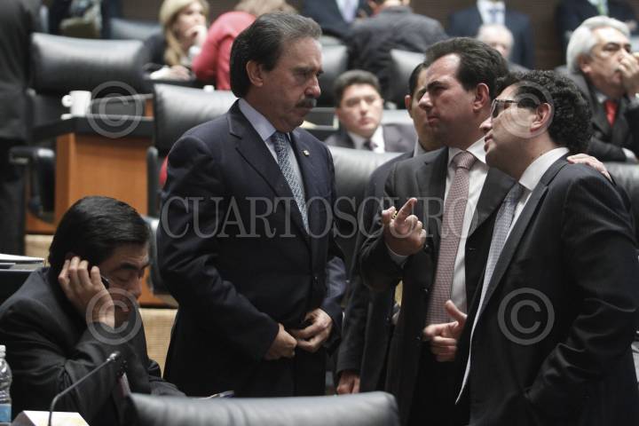 MÉXICO, D.F., 13DICIEMBRE2012.- Los senadores Miguel Barbosa, Emilio Gamboa Patrón, José Francisco Yunes y Armando Ríos Peter durante la sesión del senado donde se esta discutiendo el presupuesto 2013. FOTO: ESPECIAL /CUARTOSCURO.COM