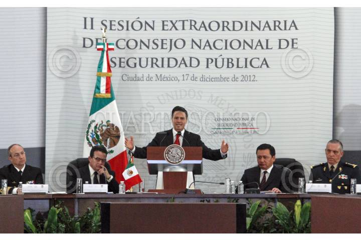 MÉXICO, D.F., 17DICIEMBRE2012.- El almirante Vidal Francisco Soberón Sanz, Secretario de Marina junto a Miguel Ángel Osorio Chong, Secretario de Gobernación y el General Salvador Cienfuegos Zepeda, Secretario de la Defensa Nacional durante la II Sesión Extraordinaria del Consejo Nacional de Seguridad Pública que tuvo lugar en Palacio Nacional. FOTO: ENRIQUE ORDÓÑEZ /CUARTOSCURO.COM