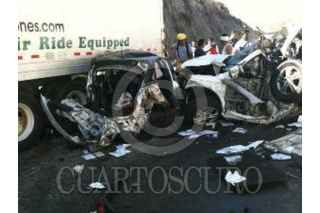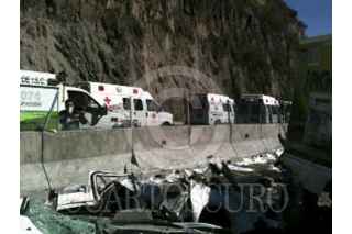 TEPEJÍ DEL RÍO, QUERÉTARO, 19DICIEMBRE2012.- Se registró una carambola en la autopista México-Querétaro, a la altura del kilómetro 80, lo que dejó un saldo de tres personas muertas y once más heridas. Los primeros reportes indican que una pipa que iba a exceso de velocidad se volcó y provocó el accidente en el que se vieron involucrados al menos 25 vehículos. Los heridos fueron trasladados a diversos hospitales del Distrito Federal y Querétaro, algunos de ellos se reportan en estado grave. La vialidad fue cerrada en ambas direcciones por tres horas, por lo que se registró un intenso tráfico, aunque posteriormente fue reabierta la circulación en dirección a la Ciudad de México. FOTO: ESPECIAL /CUARTOSCURO.COM