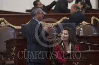 MÉXICO, D.F., 20DICIEMBRE2012.- El diputado perredista Ruben Escamilla Salinas, conversa con Laura Iraís Ballesteros Mancilla, diputada del PAN, hasta hace poco varias diputadas de este grupo parlamentario le aplicaban la ley del hielo a quien fuera delegado de Tlahuac, ya que se había visto envuelto en un escándalo sexual a raíz de un vídeo en donde le pide sexo oral a una colaboradora. FOTO: MOISÉS PABLO /CUARTOSCURO.COM