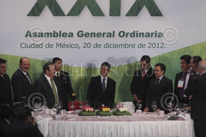 MÉXICO, D.F., 20DICIEMBRE2012.- Enrique Peña Nieto, presidente de México, acudió a la asamblea general y la toma de protesta del Consejo Nacional Agropecuario, en la mesa principal lo acompañaron los secretarios Enrique Martínez y Martínez e Ildelfonso Guajardo, los gobernadores, Cesar Horacio Duarte y Mario López Valdes así como el presidente y ex presidente del Consejo Nacional Agropecuario, Juan Carlos Cortes García y Benjamín Grayeb Ruíz. FOTO: SAÚL LÓPEZ /CUARTOSCURO.COM