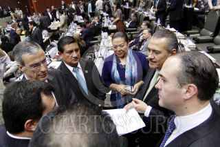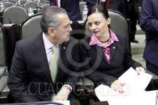 MÉXICO, D.F., 20DICIEMBRE2012.- Manlio Fabio Beltrones, coordinador de los diputados del PRI, y Nubia Magdalena Mayorga, en la sesión en la que se analiza la aprobación del Presupuesto de Egresos de la Federación 2013, durante la sesión. FOTO: CUARTOSCURO.COM