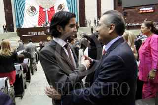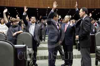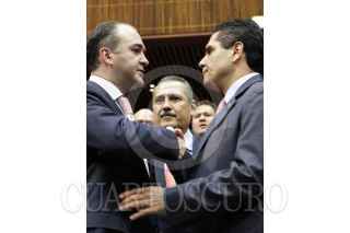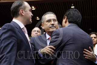 MÉXICO, D.F., 21DICIEMBRE2012.- Los diputados y coordinadores del PRI, PAN y PRD Manlio Fabio Beltrones, Alberto Villareal y Silvano Aureoles se dan el abrazo de fin de año, durante la clausura del primer periodo ordinario de sesiones del primer año legislativo de la LXII Legislatura. FOTO: CUARTOSCURO.COM