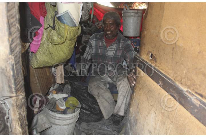 LOS REYES LA PAZ, ESTADO DE MÉXICO, 23DICIEMBRE2012.- Onesima Martínez Marros de 80 años, José Tomás Arrollo de 60 años y Bernardo Inés Cristóbal de 65, de oficio recolectores de basura, viven a las orillas de las vías del tren desde hace 20 años en un predio irregular ubicado en la frontera de los municipios de Los Reyes La Paz y Chimalhuacan. Los recolectores forman una familia al lado de perros callejeros, gatos y gallinas. Su cena de “Noche Buena” será una cacerola de lentejas y una olla de café frio. FOTO: SAÚL LÓPEZ /CUARTOSCURO.COM