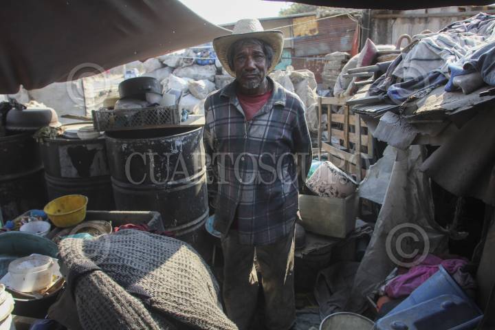 LOS REYES LA PAZ, ESTADO DE MÉXICO, 23DICIEMBRE2012.- Onesima Martínez Marros de 80 años, José Tomás Arrollo de 60 años y Bernardo Inés Cristóbal de 65, de oficio recolectores de basura, viven a las orillas de las vías del tren desde hace 20 años en un predio irregular ubicado en la frontera de los municipios de Los Reyes La Paz y Chimalhuacan. Los recolectores forman una familia al lado de perros callejeros, gatos y gallinas. Su cena de “Noche Buena” será una cacerola de lentejas y una olla de café frio. FOTO: SAÚL LÓPEZ /CUARTOSCURO.COM