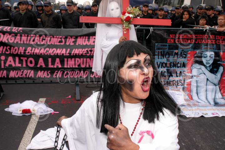MEXICO, D.F., 24JUNIO2005.- Mujeres pertenecientes a varias organizaciones civiles, se manifestaron en la entrada de la Residencia Oficial de los Pinos en donde elementos del Estado Mayor les impidieron el paso, el objetivo era hacerle llegar una carta al primer mandatario para mostrarle su inconformidad en los casos de las asesinadas de Ciudad Juárez y del resto del país. FOTO: Moisés Pablo/CUARTOSCURO.COM