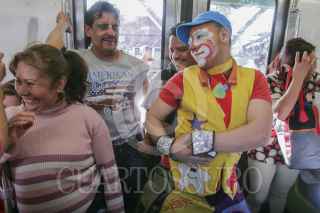 MÉXICO, D.F., 28DICIEMBRE2012.- Un payasito hace su show para ganarse unas monedas en la linea 8 del metro. A diario varios profesionales de la risa suben a los vagones del Sistema de Transporte Colectivo resguardandose de la vigilancia oficial, ya que este oficio esta prohibido en las instalaciones de ese sistema de transporte. FOTO: JUAN PABLO ZAMORA /CUARTOSCURO.COM