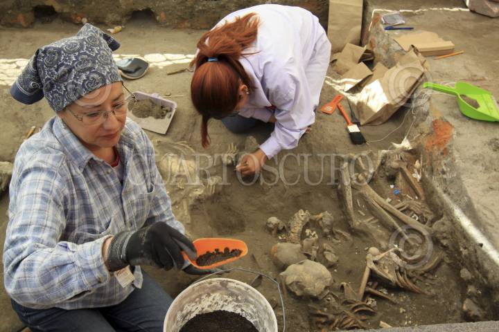 PUEBLA, PUEBLA, 31DICIEMBRE2012.- Arquéologos del Instituto Nacional de Arte e Historia (INAH) trabajan en el descubrimiento de 14 osamentas, halladas en la construcción del colector pluvial del municipio de San Andrés Cholula, Puebla el pasado fin de semana. Según los investigadores se trata del esqueleto de dos niños y doce adultos enterrados en el periodo posclásico prehispánico hace aproximadamente unos 800 años. FOTO: HILDA RÍOS/ CUARTOSCURO.COM
