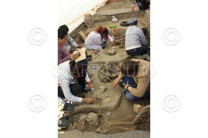PUEBLA, PUEBLA, 31DICIEMBRE2012.- Arquéologos del Instituto Nacional de Arte e Historia (INAH) trabajan en el descubrimiento de 14 osamentas, halladas en la construcción del colector pluvial del municipio de San Andrés Cholula, Puebla el pasado fin de semana. Según los investigadores se trata del esqueleto de dos niños y doce adultos enterrados en el periodo posclásico prehispánico hace aproximadamente unos 800 años. FOTO: HILDA RÍOS/ CUARTOSCURO.COM