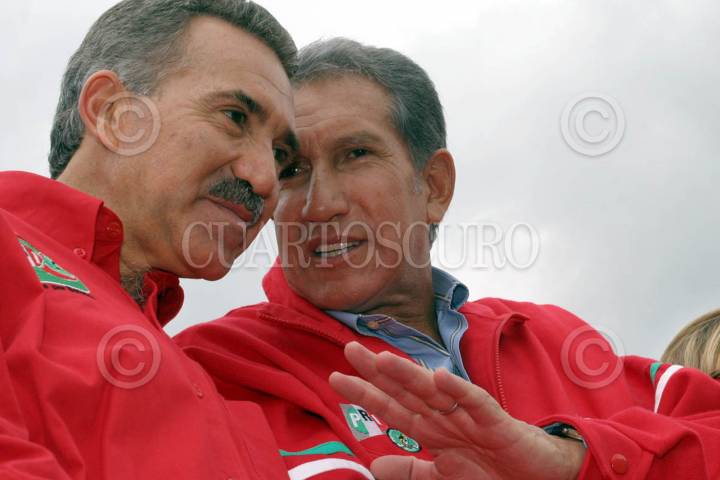 TOLUCA, EDO. MEX. 25JUNIO2005.- Jorge Emilio Gonález Martínez, presidente nacional del PVEM, Miguel Osorio Chong, gobernador de Hidalgo, Fidel Herrera, gobernador de Veracruz, Roberto Madrazo, presidente nacional del PRI, Enrique Peña Nieto, candidato a la gubernatura del estado, y Arturo Montiel, gobernador del Estado de México estuvieron presentes en el cierre de campaña del priísta Enrique Peña en la plaza central de la entidad. FOTO: Juan Flores/CUARTOSCURO.COM