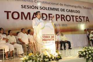 HUIMANGUILLO, TABASCO, 01ENERO2013.- El día de ayer Francisco Sánchez Ramos, tomo protesta como presidente municipal para el periodo 2013-2015, acto efectuado en el Casino del Pueblo; donde se contó con la presencia del gobernador Arturo Núñez Jiménez, como invitado especial. FOTO: MARCO POLO GUZMÁN HERNÁNDEZ /CUARTOSCURO.COM