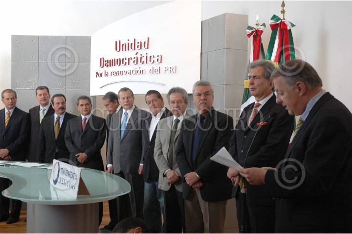 MEXICO, D.F. JUNIO2005.- Manuel Ángel Núñez Soto, Arturo Montiel, gobernador del Estado de México, Tomás Yarrington, Enrique Martínez, gobernador de Coahuila, Enrique Jackson, senador, al fondo Miguel Alemán y José natividad Parás a su llegada a la firma del convenio del TUCOM para la elección interna de candidatos a la presidencia del PRI. FOTO: Iván Stephens/CUARTOSCURO.COM
