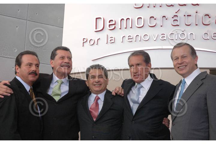 MEXICO, D.F. JUNIO2005.- Manuel Ángel Núñez Soto, Arturo Montiel, gobernador del Estado de México, Tomás Yarrington, Enrique Martínez, gobernador de Coahuila, Enrique Jackson, senador, al fondo Miguel Alemán y José natividad Parás a su llegada a la firma del convenio del TUCOM para la elección interna de candidatos a la presidencia del PRI. FOTO: Iván Stephens/CUARTOSCURO.COM