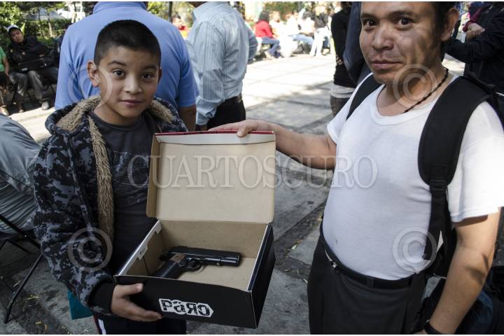 MÉXICO, D.F., 03ENERO2013.- Un niño acompañado de su mamá acude a entregar sus armas de juguete durante el programa de entrega de armas voluntarias de habitantes de la delegación Iztapalapa. El programa busca incentivar con una pequeña remuneración económica a las personas que entreguen cual quier tipo de armas de fuego. Cabe resaltar que en lo que el programa se han entregado más de mil armas de fuego según datos de la dependencia gubernamental. FOTO: EMILIANO RUVAL / CUARTOSCURO.COM