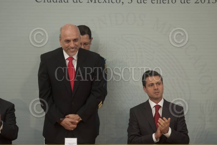 MÉXICO, D.F., 03ENERO2013.- Emilio Chuayffet, secretario Educación Pública, Enrique Cabrero Mendoza, nuevo director del Consejo Nacional de Ciencia y Tecnología, Enrique Peña Nieto, Presidente de México, Ildefonso Guajardo, secretario de Economía y José Narro Robles, rector de la UNAM, en la ceremonia de toma de protesta del Conacyt. FOTO: MOISÉS PABLO /CUARTOSCURO.COM