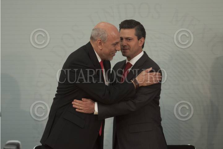 MÉXICO, D.F., 03ENERO2013.- Emilio Chuayffet, secretario Educación Pública, Enrique Cabrero Mendoza, nuevo director del Consejo Nacional de Ciencia y Tecnología, Enrique Peña Nieto, Presidente de México, Ildefonso Guajardo, secretario de Economía y José Narro Robles, rector de la UNAM, en la ceremonia de toma de protesta del Conacyt. FOTO: MOISÉS PABLO /CUARTOSCURO.COM