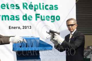 MÉXICO, D.F., 04ENERO2013.- Miguel Ángel Treviño, titular de la Procuraduria Federal del Consumidor, y Miguel Ángel Mancera, Jefe de Gobierno, encabezaron la destrucción de juguetes réplicas de armas de fuego. FOTO: MOISÉS PABLO / CUARTOSCURO.COM