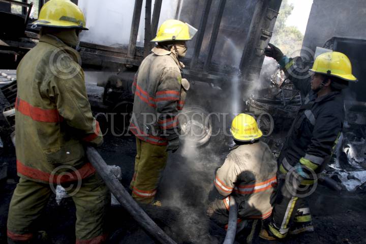 CUERNAVACA, MORELOS., 06ENERO2013.- En la carretera Cuernavaca-México a la altura del kilómetro 93+8oo, un tráiler de doble remolque se impacto en una antena de CAPUFE quedando en cenizas la cabina y uno de los remolques, que transportaba materiales para la construcción. FOTOS: ALMA LAFAYET /CUARTOSCURO.COM