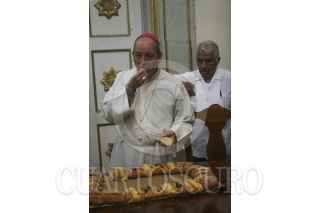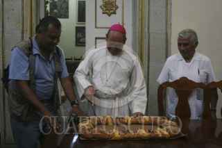 OAXACA, OAXACA 06ENERO2013.- El arzobispo de la Diócesis de Antequera, José Luis Chávez Botello (izquierda) acompañado del vocero de la Diócesis, (Guadalupe Barragán (derecha) cortó este día la tradicional rosca de reyes en compañía de trabajadores de los medios de comunicación. FOTO: ARTURO PÉREZ ALFONSO/CUARTOSCURO.COM