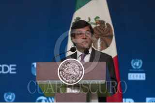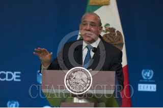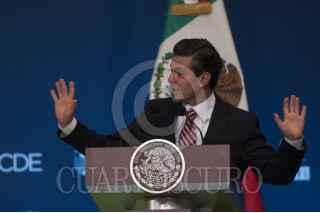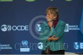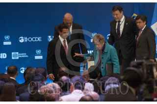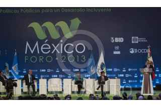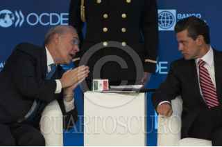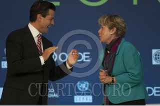 MÉXICO, D.F., 09ENERO2013.- Enrique Peña Nieto, Presidente de México, ayuda a bajar del estrado a Alicia Bárcena Ibarra, secretaria ejecutiva de la Comisión Económica para América Latina y el Caribe (Cepal), al finalizar la inauguración del Foro México 2013. FOTO: MOISÉS PABLO /CUARTOSCURO.COM
