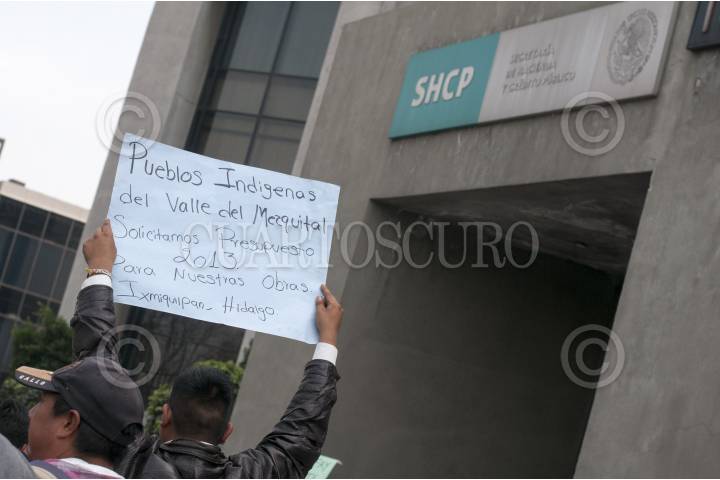 MÉXICO, D.F., 15ENERO2013.- Cientos de personas pertenecientes a los pueblos indígenas del valle del Mezquital en Ixmiquilpan, Hidalgo, realizaron una manifestación afuera de la sede de la Secretaría de Hacienda y Crédito Público ubicada sobre avenida Constituyentes, exigiendo a las autoridades el presupuesto económico 2013 para las obras públicas de su municipio que manifestaron, les despojaron algunos diputados de Hidalgo pertenecientes al PRI. FOTO: DIEGO SIMÓN SÁNCHEZ / CUARTOSCURO.COM